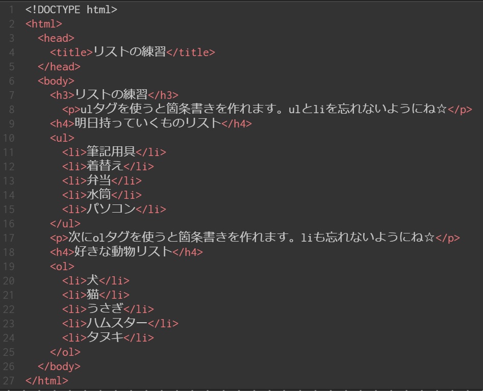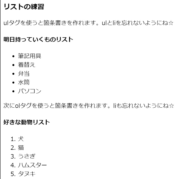 <ul>タグは、箇条書きを表します。<li>タグを追加していくことで箇条書きにすることができます。