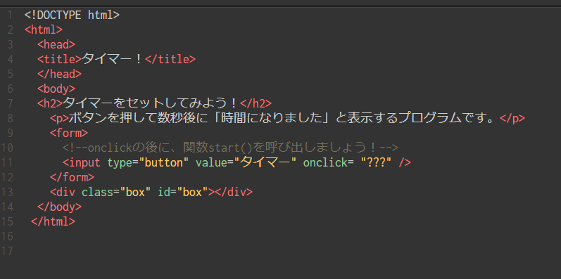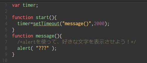 ボタンを押して数秒後に「時間になりました」と表示するプログラムです。