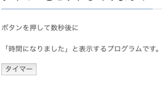 入力内容 HTML JavaScript 出力 タイマーをセットしてみよう! ボタンを押して数秒後に「時間になりました」と表示するプログラムです。