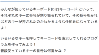 入力内容 HTML CSS JavaScript 出力 キーコード みんなが使っているキーボードには|キーコード|といって、それぞれのキーに番号が割り振られていて、その番号をみればどのキーが押されたのかわかるような仕組み …