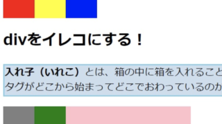 入力内容 HTML 上記では、<div>タグをさらに<div>タグで囲っています。これを「入れ子」またはネスといいます。 この入れ子構造を使うと、タグがどこで始まりどこで終わるのか分かりづらくなる …