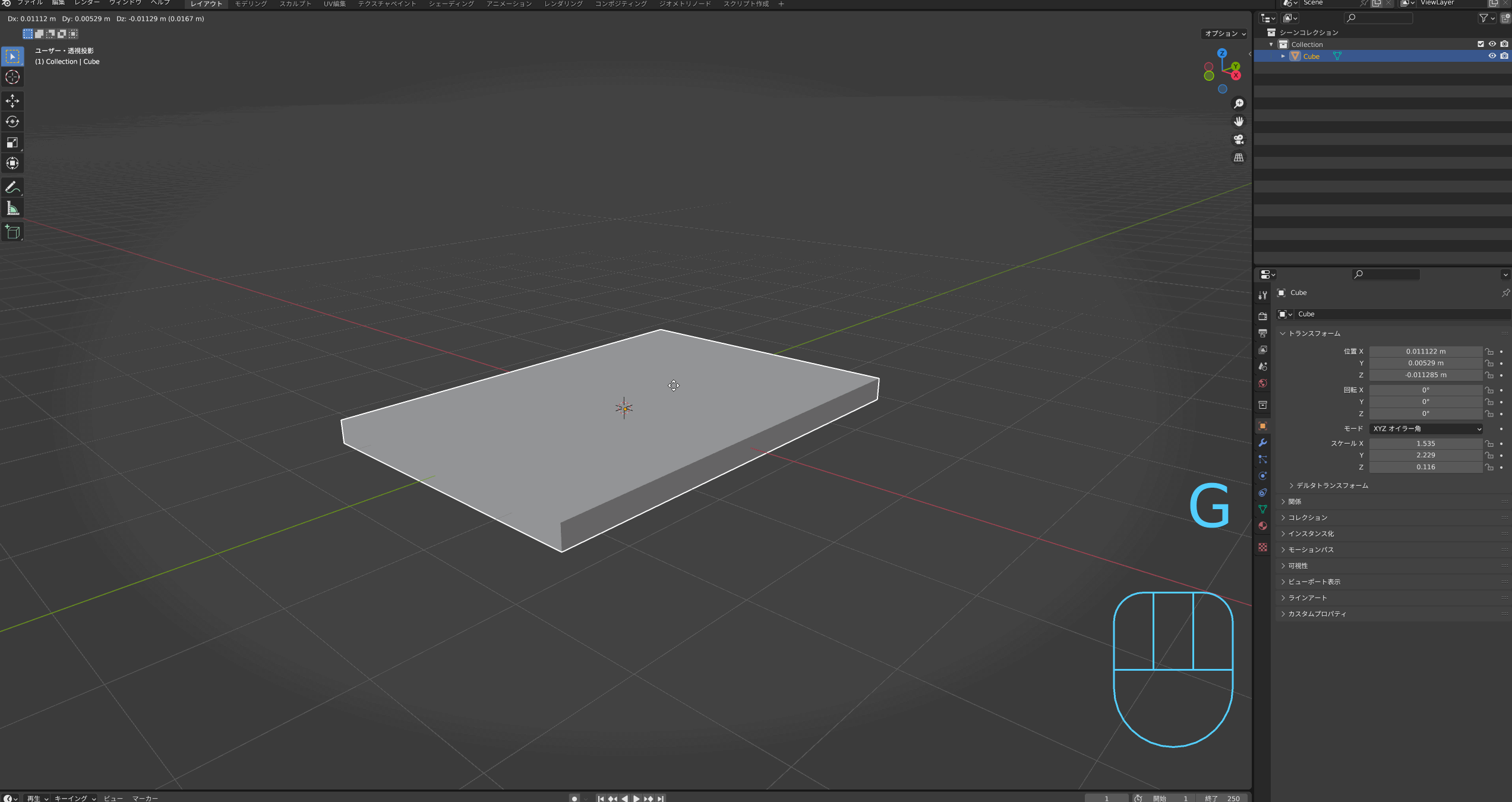 特定の軸方向のみへの移動:G+X/Y/Z(Gを押して移動モードにした後、方向を指定します。同時押しではありません。)