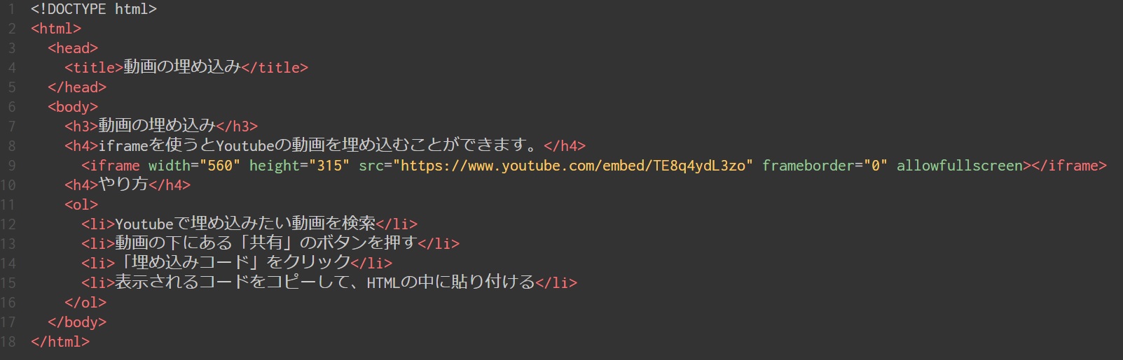 <iframe>タグは、動画を追加することができます。Youtubeから埋め込みコードをコピーして来て、貼り付けるだけで、動画を追加することができます。
