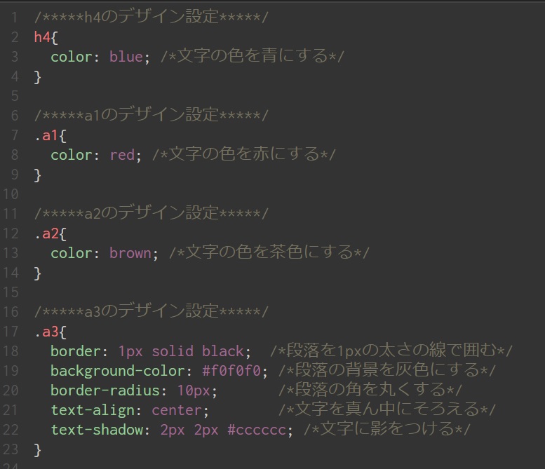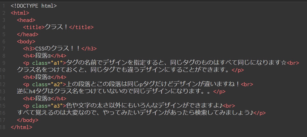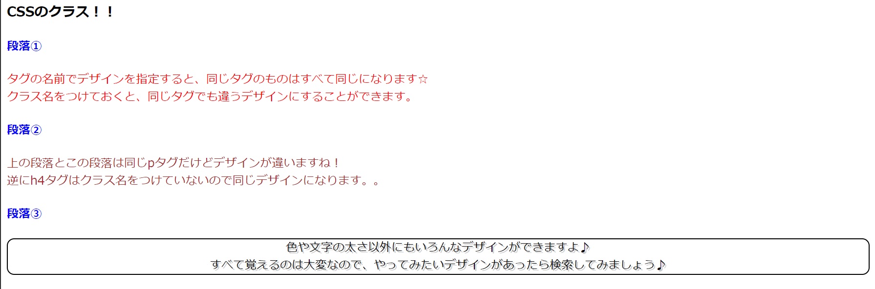 タグにクラス名をつけると、同じタグでもクラスごとにデザインを変更することができます。