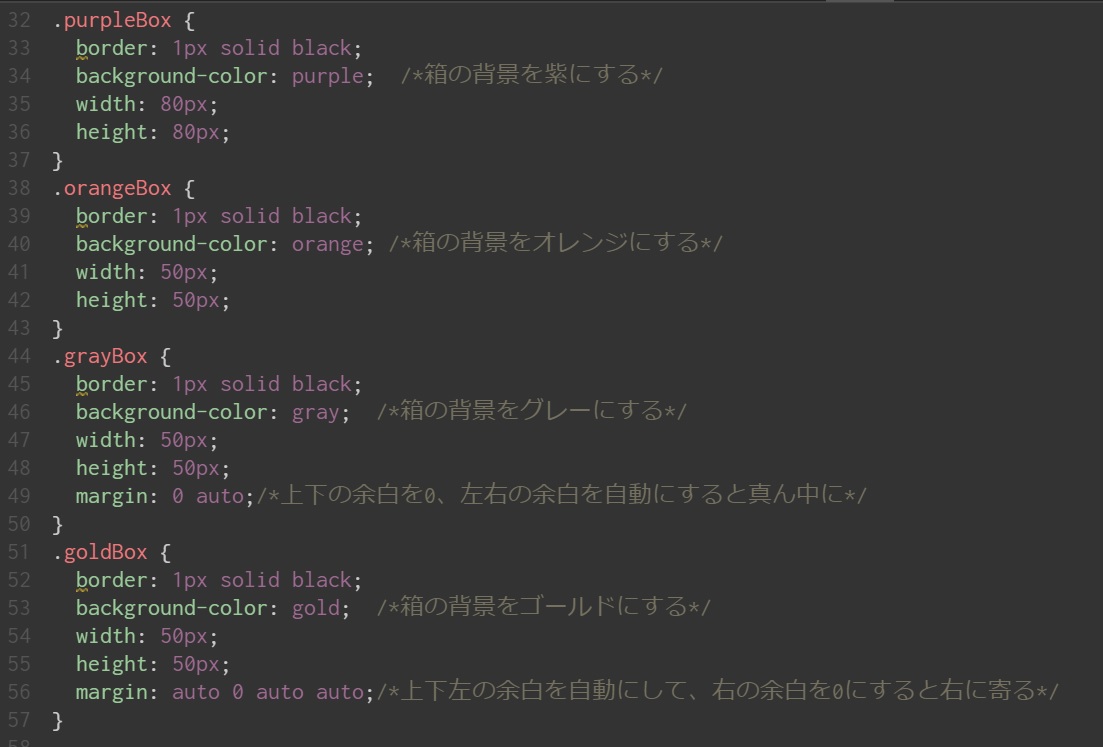 「margin」は上下の余白を指定することができます。「margin: 0 auto」とすることで、上下の余白を0、左右の余白を自動とすることができます。左右を自動とすると中央にボックスが移動します。
