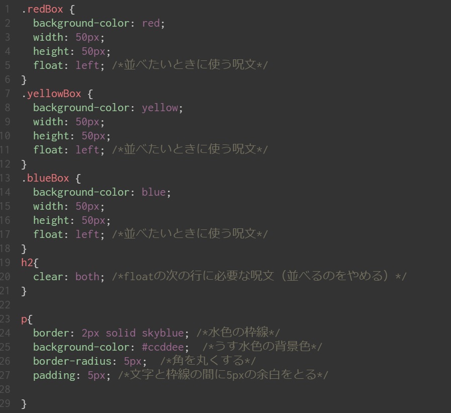 「float」は浮くという意味です。この「float」を使うことで箱同士を横に並べることができます。