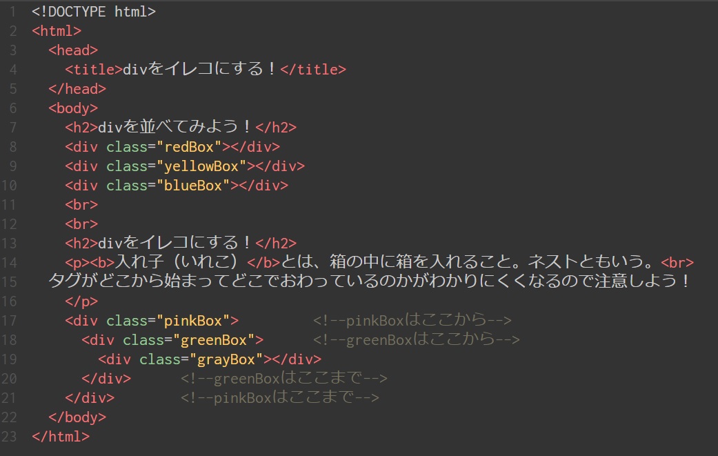 上記では、<div>タグをさらに<div>タグで囲っています。これを「入れ子」またはネスといいます。