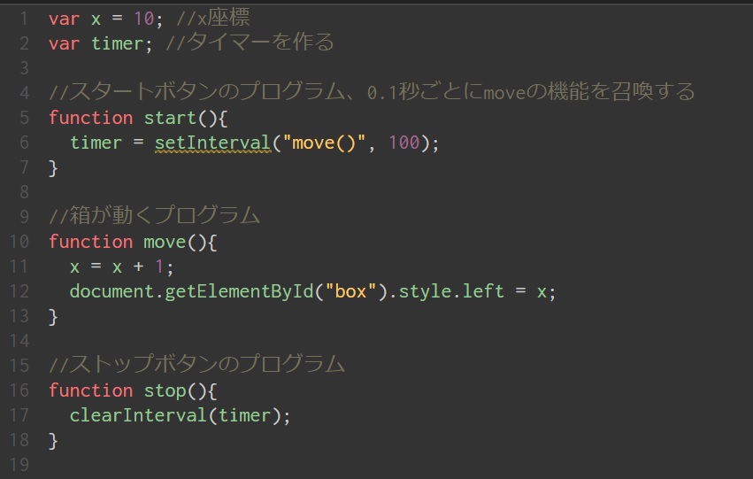 ここで、setInterval 関数を「timer」と紐づけることで、どの setInterval 関数を止めるかを明確化しています。