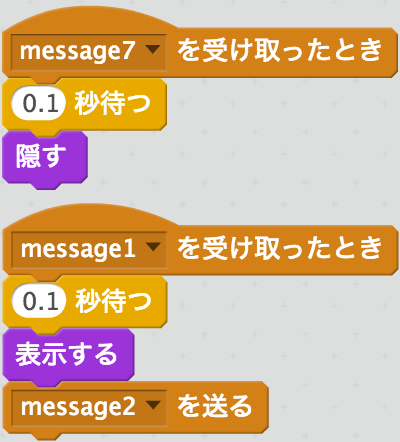 - (炎編)炎をドラゴンからケーキまで並べます。それぞれに’旗がクリックされたとき隠す’と’ひとつ前の炎(もしくはドラゴン)からのメッセージを受け取ったら 少し待って表示させて次のメッセージを送る’と’後の炎からメッセージを受け取ったら隠す’を組みます。