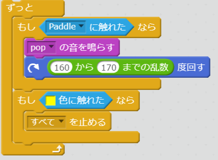 - 「調べる」よりもし棒に触れたら「pop」と音を鳴らし、乱数を使って170~180度の間で向きを変えます。