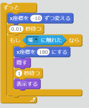 - 旗が押されたら初期位置を設定し、xをマイナス方向に変化させ、条件の「もし〜なら」より壁に触れたら 初期位置に戻すようにします