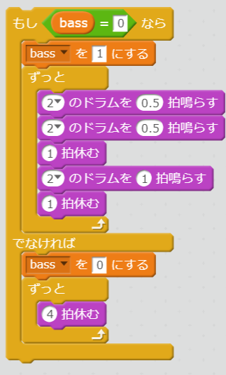 - 条件「もし〜ならば〜、でなければ」を使い、「bass」が0なら 1に変化させ、「2」のドラムの音を0.5泊で2回、1泊休んで0.5泊鳴らして1泊休みます。これを条件「ずっと」で繰り返します