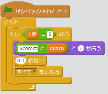 - 旗が押されたらを追加し、条件「もし〜なら」と「○と○」を言うを使って、「HP」が0なら「scoreは○○です」と言うようにし0.1秒待って「すべてを止める」をします。これをずっと繰り返し常に「もし」を判定できるようにします