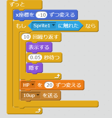 - x座標をマイナス方向に変化させ、もし「sprite1」に触れたなら「表示する」、「0.05秒待つ」、「隠す」を10回繰り返します