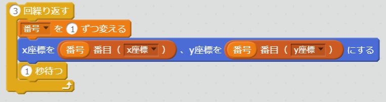 - x座標を変数「番号」 番目のリスト「x座標」)へ、y座標を(変数「番号」 番目のリスト「y座標」)に移動させます