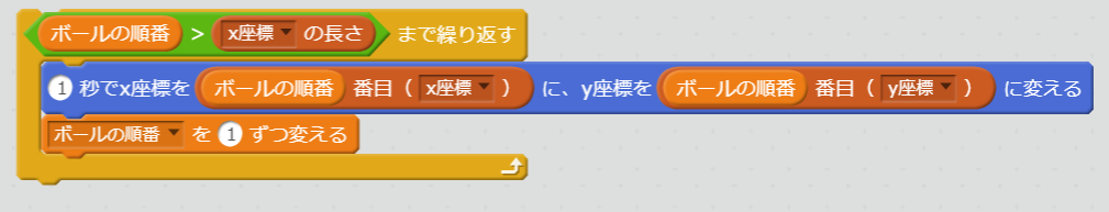 - ボールの順番 > まで繰り返すの中に1秒でx座標をボールの順番