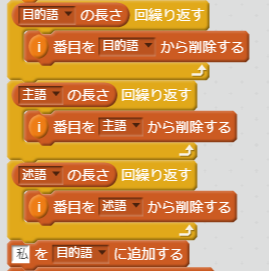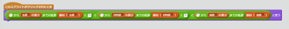 - ~というの上に、1から主語までの長さの乱数番目(主語)が1から目的語までの乱数番目(目的語)を1から述語までの乱数番目(述語)というように作ります(演算ブロックをうまく組み合わせよう!)