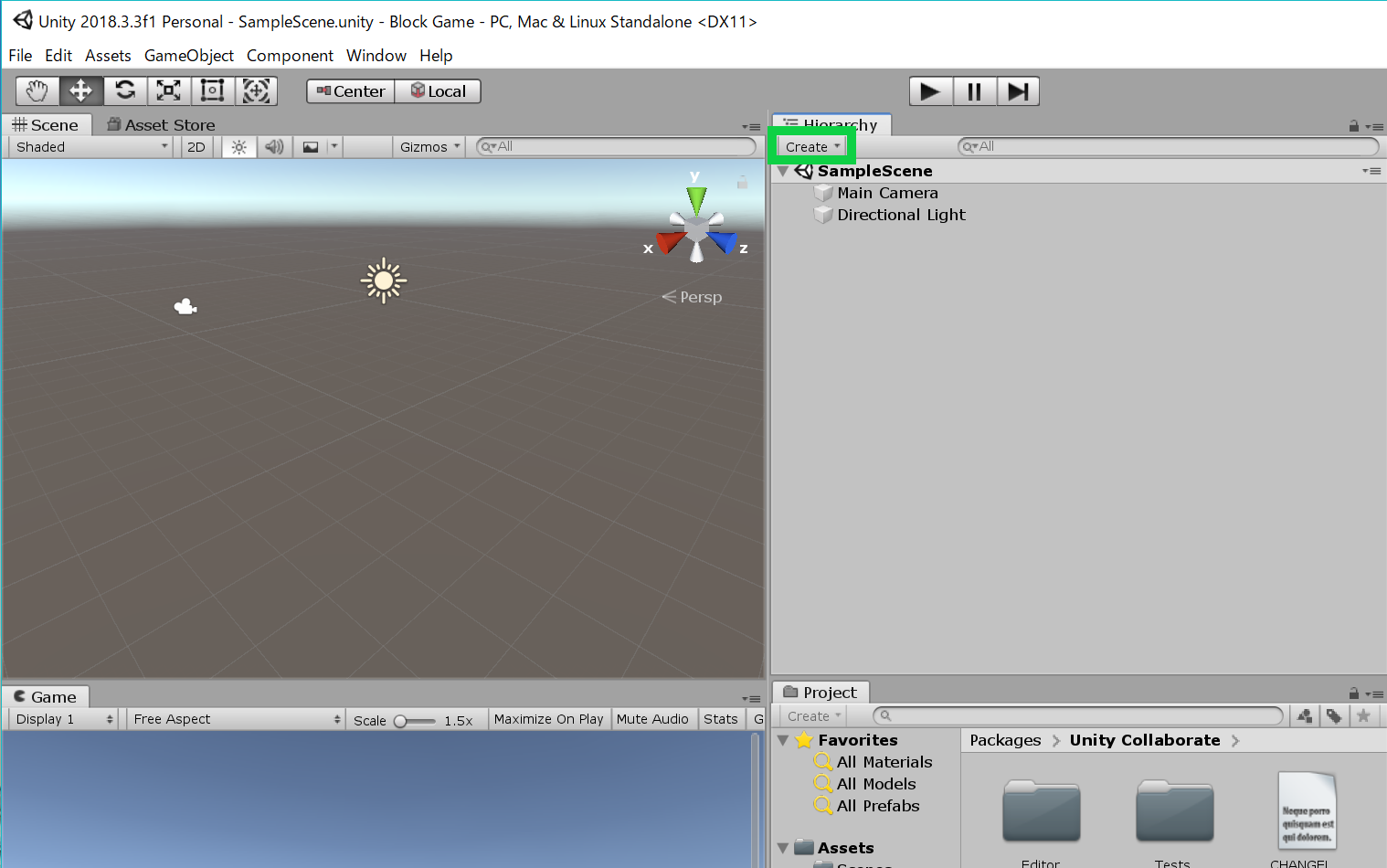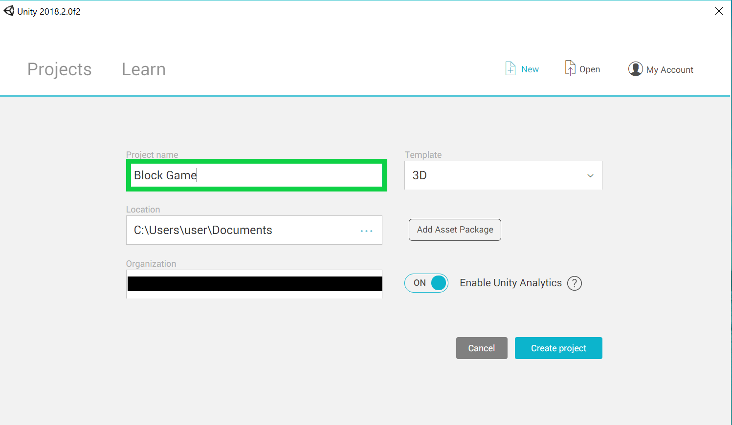 2. 名前は、「Block Game」とします。「Create projct」をクリックしてください。