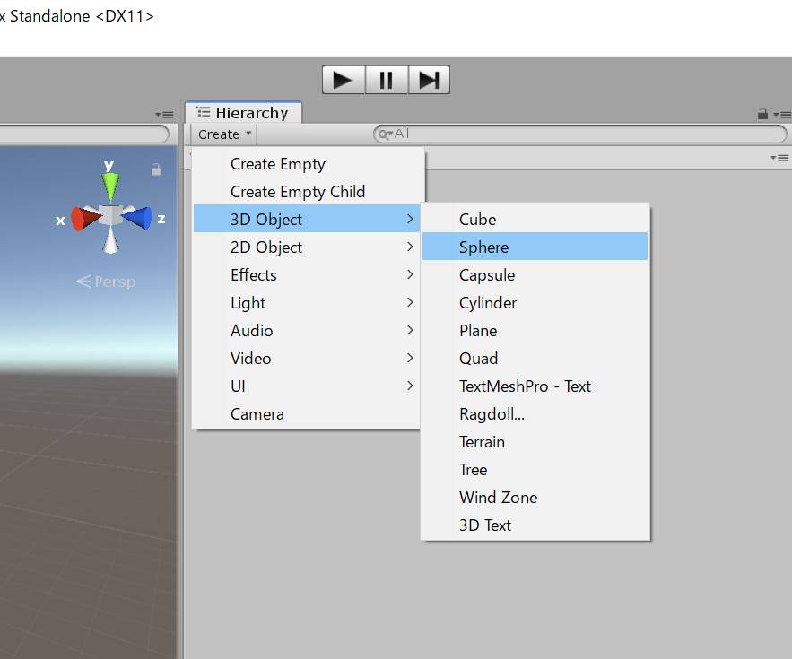 1. まずは、「Sphere」を追加します。Sphere とは、英語で「球」という意味です。
