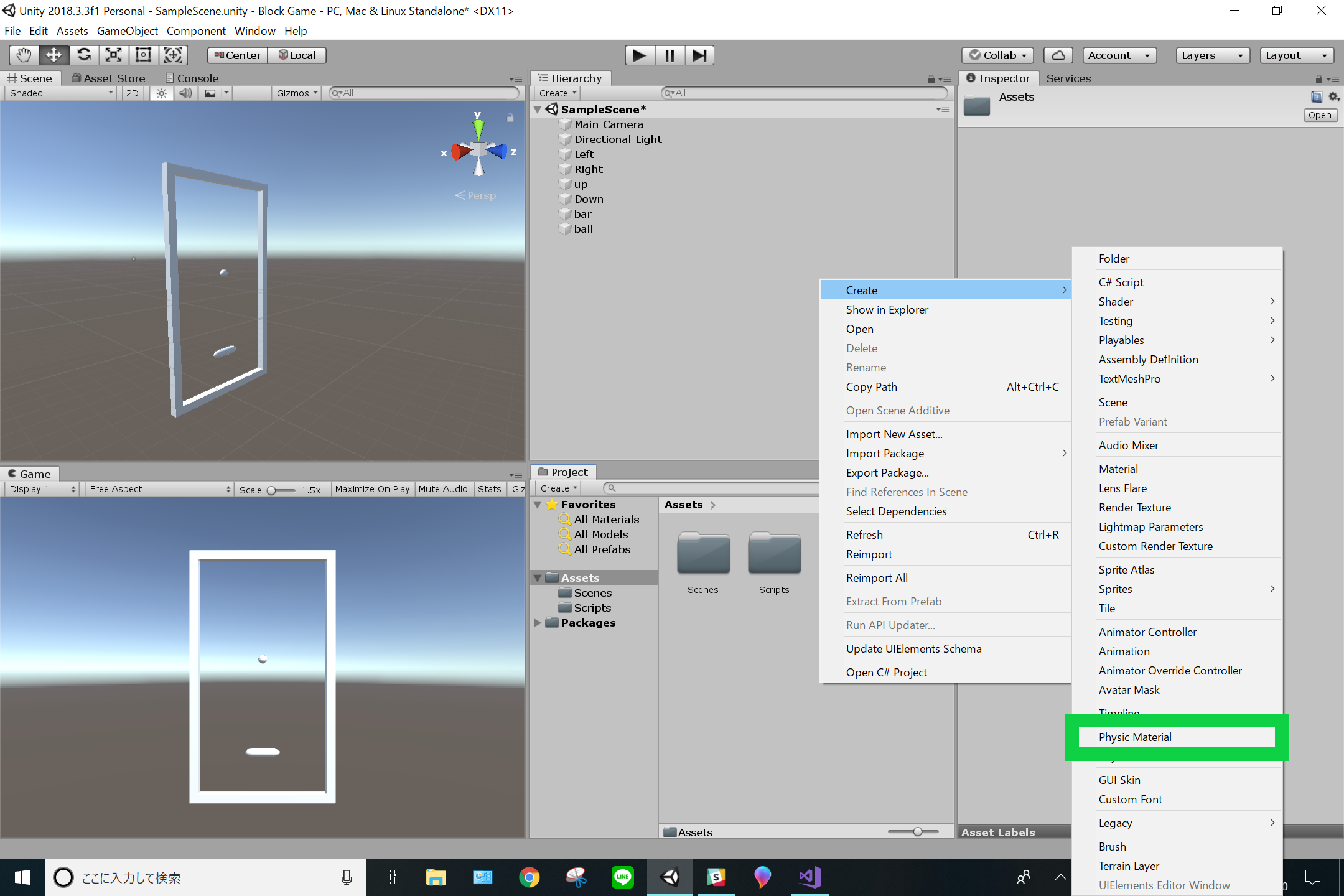 3. 下記のように、Assets内に右クリックで、「Physic Material」をクリックします。