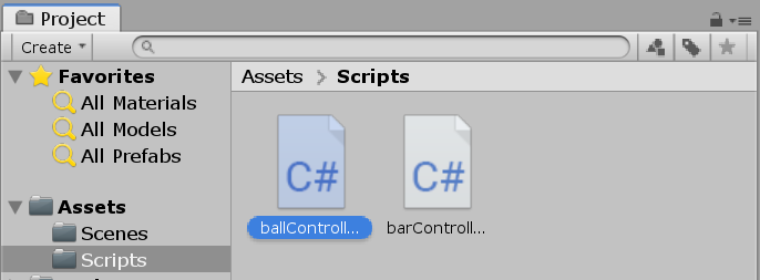5. フォルダ「Scripts」に移動し、右クリックで新規C#ファイルを作り、名前を「ballController」とします。