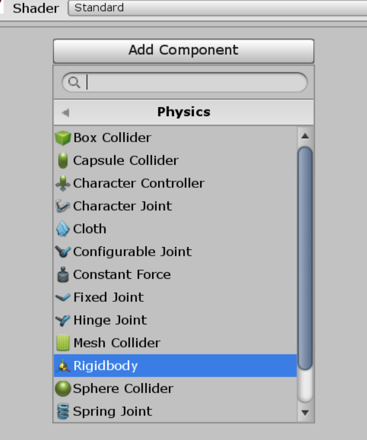 3. コンポーネントの追加から、「Physics」→「Rightbody」から、Rightbody を追加します。