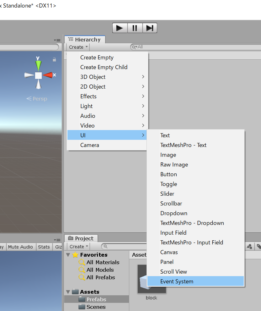 1. 次に、「Event System」を追加し、名前を「blockController」とします。