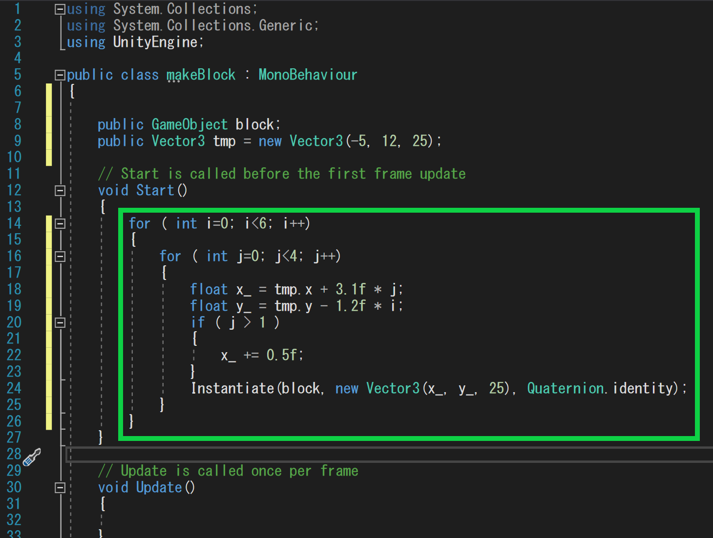 順序よくブロックを作るために、現在の行目と列目によって、ブロックの位置が変わるようにしています。