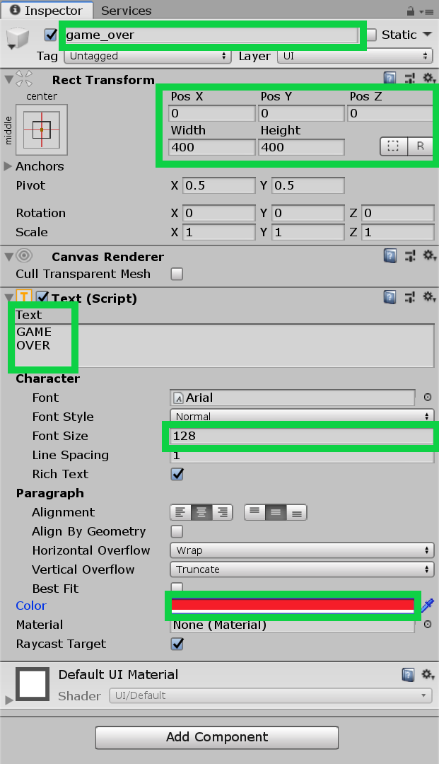 1. まず「Text」を追加し、下記のようにパラメータを設定します。