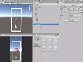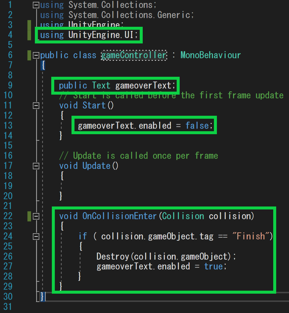 ここでは、当たったオブジェクトのタブが “Finish” だった時に、そのオブジェクトを破壊し、ゲームオーバーが表示されるようにコーディングされています。
