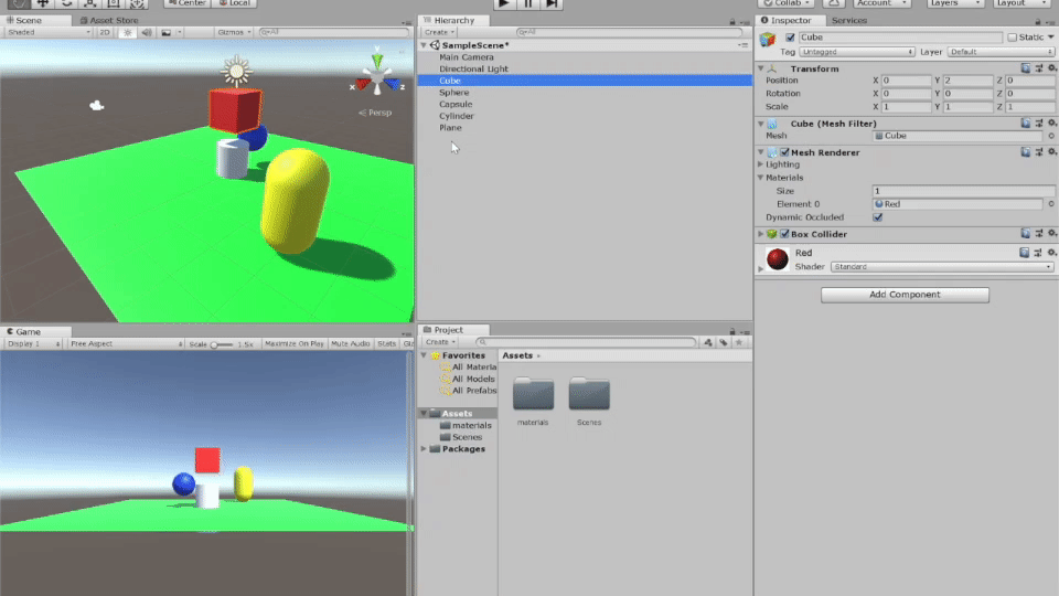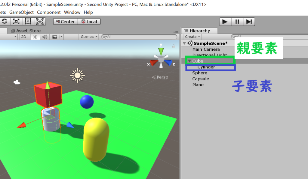 ちなみに下記の場合、Cubeが「親要素」といい、Cylinderが「子要素」と言います。