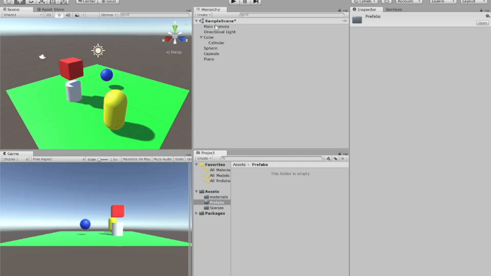 プレハブはAseetの種類の1つです。 再利用可能なゲームオブジェクトでプロジェクトビューに保存されます。プレハブは複数のシーンにも、また、1つのシーンに複数追加する事も出来ます。 プレハブをシーンに追加する時はインスタンス(instance)が生成されます。プレハブのインスタンスは、全てオリジナルのプレハブにリンクしているため、意味的にはクローンとなります。プロジェクトに存在するインスタンスの数に限らず、プレハブに変更を加えると、インスタンスにも反映されます。