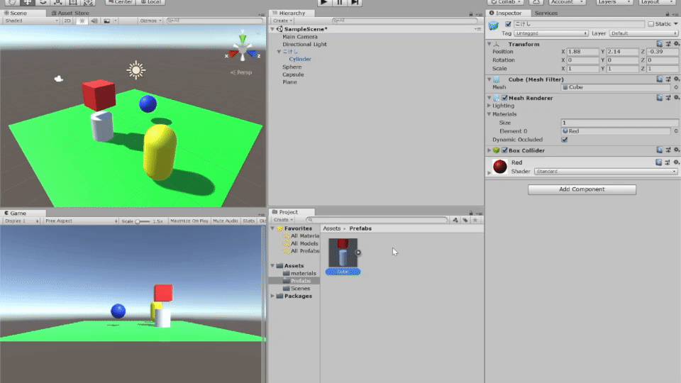 これによって、Prefabを作ることができます。先生はPrefabの名前を「こけし」にしました(笑)